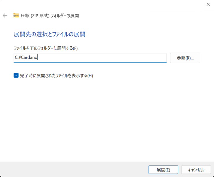 圧縮(ZIP形式)フォルダーの展開ダイアログで展開先をC:\Cardanoにし展開を選択します